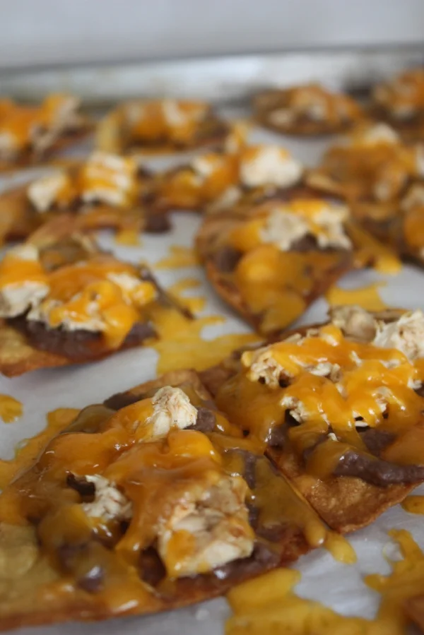 Place topped chips on baking tray lined with parchment paper. Then, place tray in the oven and bake for 5 minutes until the cheese is melted.